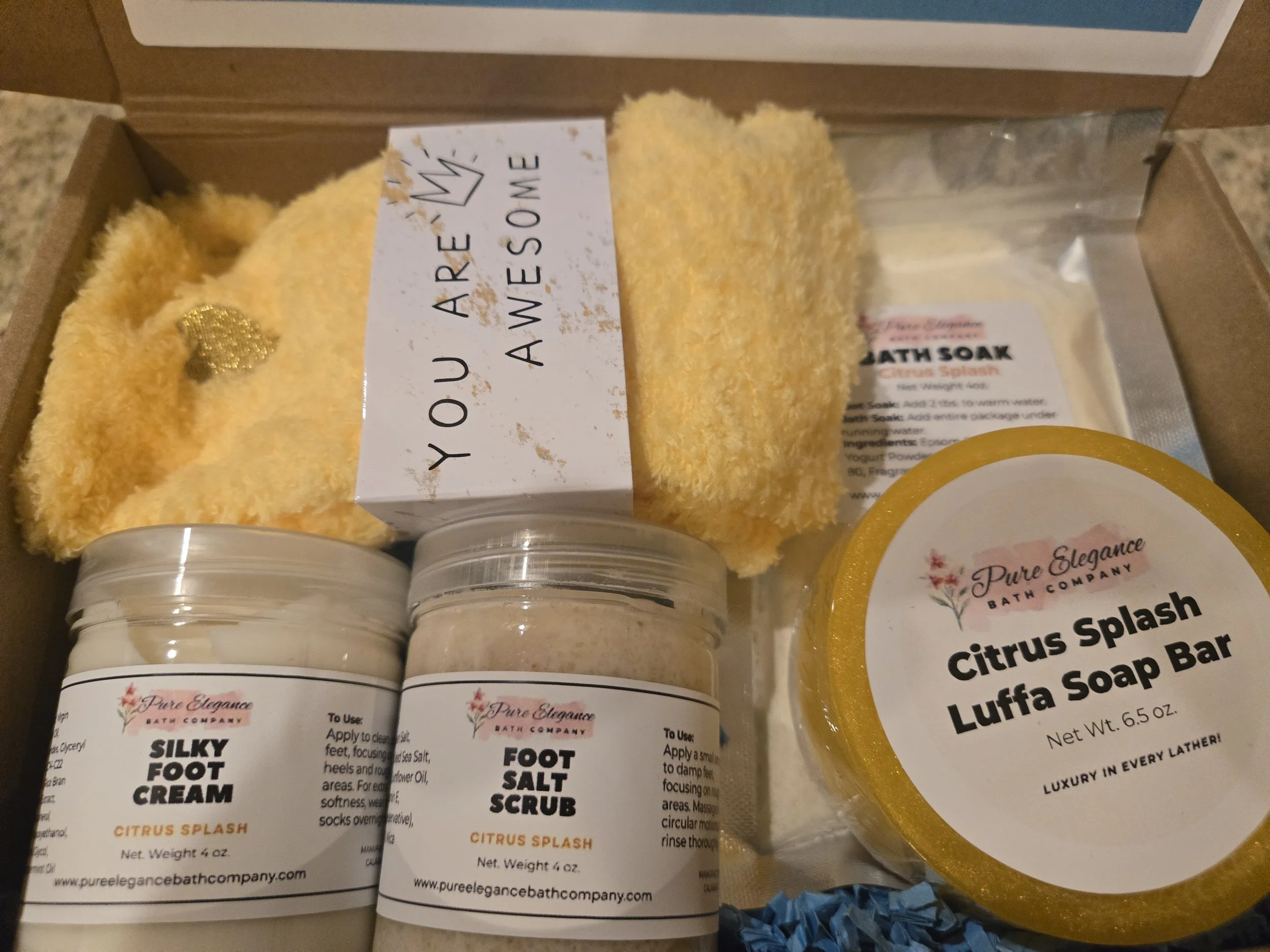 Inside you'll find a warming foot soak, exfoliating salt scrub, rich and creamy foot lotion, luffa soap bar, and the softest, fluffiest socks ever (socks may vary)—an instant recipe for relaxation.